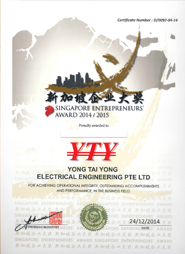 YONG TAI YONG ELECTRICAL ENGINEERING PTE LTD was presented with SINGAPORE ENTREPRENEURS' AWARD 2014/2015 on 24 December 2014 for achieving Operational Integrity, Outstanding Achivements and Performance.
